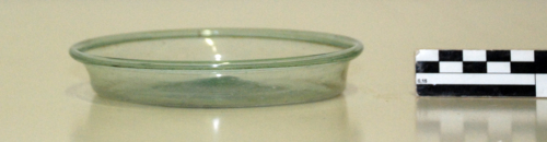 Piatto con orlo ribattuto a cordoncino sottolineato all'interno da una scanalatura; cavo con parete verticale leggermente rientrante e base piana.