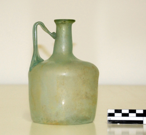 Bottiglia con orlo svasato ribattuto, collo sottile sottolineato da una strozzatura alla base, con corpo cubico e base concava. Tra il collo e la spalla, tondeggiante, si imposta un'ansa a tre nervature, piegata ad angolo acuto.