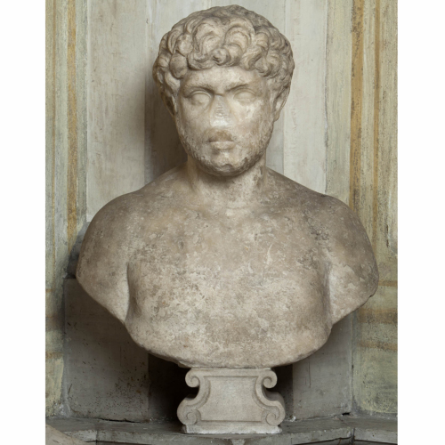 Il busto ritrae una figura maschile: il volto è descritto da un ovale pieno, in cui il modellato lascia intravedere una struttura ossea sottostante marcata, con zigomi alti e mascella prominente. La fronte è stretta, perché ingombra dalla ricca acconciatura, con boccoli, simili a fiocchi di cotone, sinuosi, che scendono folti sulle tempie. L'espressione decisa del volto è accentuata dal taglio delle soppracciglia dalla forma sottile e dalla resa degli occhi, che si allungano verso le tempie. Il naso è in parte abraso, mentre la bocca, ugualmente mal conservata, è contornata da barba e baffi resi con solchi sottili di scalpello. Il busto è nudo.