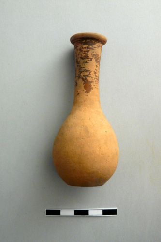 alto collo con labbro svasato e ingrossato, corpo piriforme e fondo piano; orlo e collo origine verniciati sia internamente che esternamente