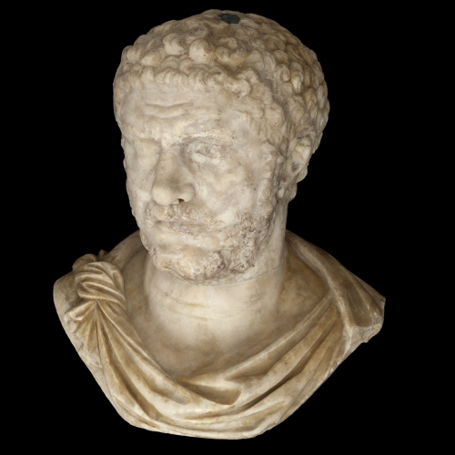 Il ritratto raffigura un uomo dall'aspetto maturo, il cui volto è piegato verso destra. Esso è caratterizzato dall'ampia fronte solcata da rughe, da arcate arcuate, con soppracciglia folte e spesse che quasi si congiungono sopra il setto nasale. Gli occhi sono grandi e intenti in una mesta riflessione che traspare attraverso l'iride e la pupilla incise e rivolte verso il basso. Il naso si apre in una punta ampia e appena schiacciata. La bocca, chiusa in un'espressione seria, è in parte coperta dai baffi, che si uniscono ad un'ispida barba. L'acconciatura è costituita da capelli resi solo mediante la lavorazione a scalpello: essi sono corti e riccioluti, sebbene aderiscano completamente alla calotta cranica.