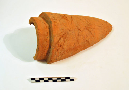 Fistula acquaria, con parete cilindrica che si restringe ad una estremità per consentire linserimento di un tubo nellaltro, incisioni circolari e parallele alla base di questa estremità. Terracotta di colore arancio con inclusi biancastri.