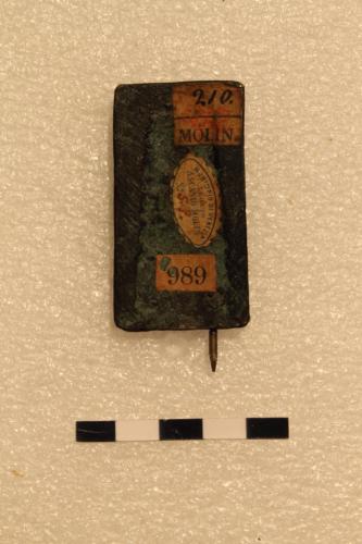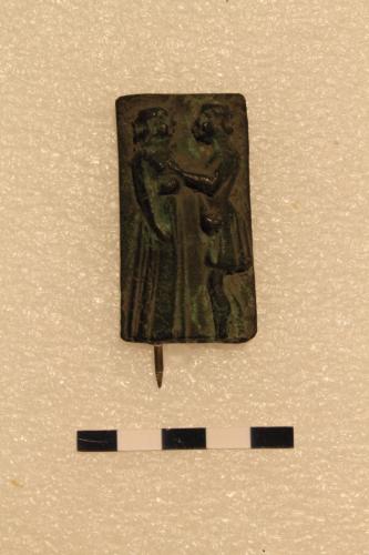 Lastrina rettangolare con due figure di profilo, affrontate. A sinistra figura femminile con lunga veste; a destra figura maschile, con tunica alle ginocchia; il braccio sinistro poggia sulla spalla della donna. Scena di commiato o scena di danza (si noti la posizione dei piedi dell'uomo).