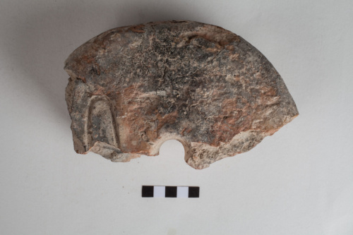 frammento di grande peso di forma circolare con foro centrale a sezione circolare; su una delle due facce è presente un segno curvilineo; impasto semi-grossolano di colore grigio-rossiccio; superfici rozzamente lisciate