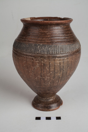 Olletta ovoidale con piede distinto e articolato, spalla allungata, collo troncoconico, orlo leggermente esoverso, arrotondato. Decorazione a stralucido e a impressione; stralucido a campitura piena sul piede, nella parte inferiore del corpo e dal collo all'orlo; a linee verticali sul ventre; decorazione impressa con motivi verticali a falsa cordicella sulla spalla. Impasto fine, di colore arancio.