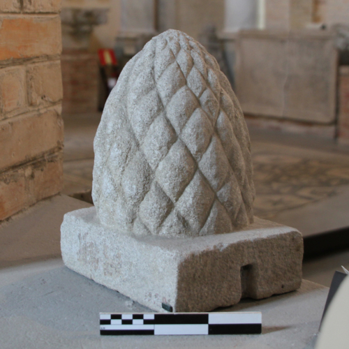 Il coperchio di urna qui descritto è stato realizzato in pietra calcarea bianca. Raffigura una pigna che poggia su un basamento di forma rettangolare, ai cui lati si individuano dei fori, forse per il fissaggio.