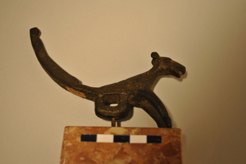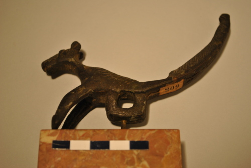 Maniglia a incastro a forma di canide con muso allungato e occhi sporgenti. Coda lunga, a sezione triangolare, con terminazione ingrossata e avvallamento all'attacco con il dorso. Le zampe anteriori poggiano su una "linea di terra". Al posto delle zampe posteriori vi è un innesto rettangolare con foro passante poligonale. Il pelame del dorso e della coda è reso schematicamente.
