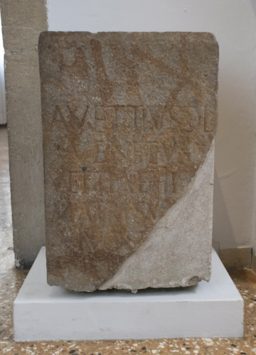 - ISCRIZIONI sulla fronte del cippo - A(ulus) Vettius |(mulieris) l(ibertus) / Venetus / Vettiae Hila[3] / matri su[3] / vivos D[ - lettere capitali apicate - a incisione - latino