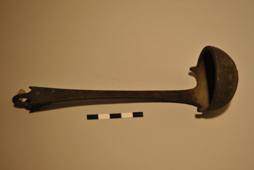 Attingitoio/simpulum con conca tondeggiante, profonda, decorata da due volute all'attacco del manico. Manico a sezione rettangolare con estremità sottolineata da due apofisi e terminante in una testa zoomorfa: cane/lupo con muso allungato, bocca chiusa, occhi con pupilla marcata, orecchie triangolari.