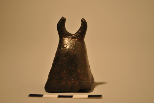 Tintinnabulum a base rettangolare. Presa poligonale frammentata con foro circolare passante. Manca il batacchio.