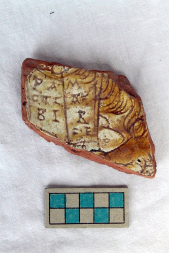 Probabile scodellone di cui si conserva un frammento di parete. La superficie interna è ingobbiata, graffita e dipinta sotto vetrina. Il rovescio è privo di rivestimento. Il decoro graffito è caratterizzato dalla figura di un leone con libro aperto includente l'iscrizione "Pacs tibi Marce", interpretabile con la figura dell'evangelista Marco patrono di Venezia con il vangelo aperto. Il decoro graffito è marcato da pennellate di colore giallo e verde.
