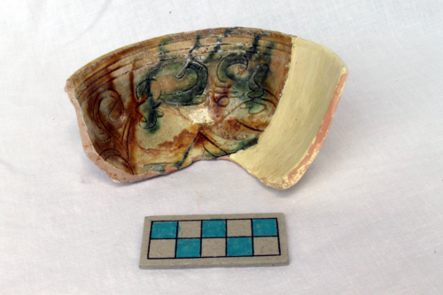 Scodella con vasca a profilo campaniforme. La superficie interna è ingobbiata, graffita e dipinta sotto vetrina. Il decoro è costituito da tralci fitomorfi, alternati a cerchi tagliati in croce, sulle pareti della vasca e da un motivo stellato al centro del cavetto. Anche la superficie esterna è ingobbiata, graffita e dipinta sotto vetrina con decorazione a tralci fitomorfi alternati a cerchi tagliati in croce. Sul cavetto si rilevano i segni lasciati dallo stacco del treppiede di cottura.
