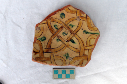 Piatto con piede ad anello e attacco di parete obliqua. La superificie interna è ingobbiata, graffita e dipinta; quella esterna è ingobbiata e invetriata con risparmio del piede. Il decoro graffito è costituito da un motivo ad intreccio, marcato da pennellate di colore giallo, che include piccoli cerchi dipinti in verde. Sono rilevabili i segni lasciati dallo stacco del treppiede di cottura. Sulla superficie esterna si rilevano grossi vacuoli.