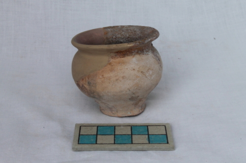 Vasetto portaspezie con alto piede a disco, corpo globulare, breve collo, orlo estroflesso e labbro arrotondato. La superficie interna è ingobbiata e rivestita da vetrina di colore verde oliva, mentre la superficie esterna è ingobbiata e invetriata parzialmente con colature di vetrina sul piede.