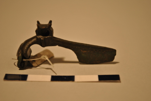 Fibula, mancante dell'ago, con lunga staffa trapezoidale; arco evidenziato da un elemento di forma cubica quadricuspidato. Molla a sette spirali (evidenti: tre a sinistra e quattro a destra) con copertura di forma triangolare modanata.