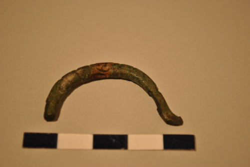 Fibula di cui rimane l'arco a sezione circolare, decorato da solcature.
