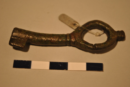 Chiave a mandata con anello oblungo, decorato da un piccolo bulbo alla sommità. Stelo tubolare, cavo. Elemento trasversale di forma rettangolare.
