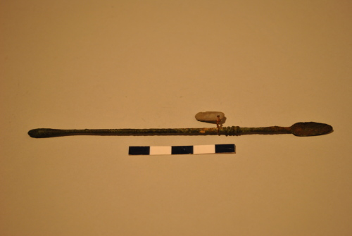 Spatola/spathomele con stelo modanato. Una estremità termina in un ingrossamento a oliva. L'altra in un lungo cucchiaino oblungo e profondo.