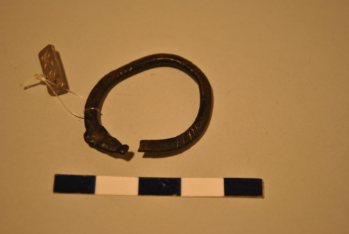Braccialetto in verga a sezione ovale, decorato a linee oblique. Una estremità è frammentata; l'altra termina in una testa stilizzata di animale.