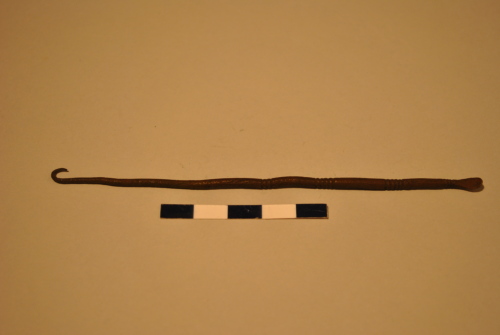 Specillo/sonda con stelo modanato. Piccola spatola circolare, leggermente inclinata. L'estremità appuntita è piegata a uncino=hamulus.