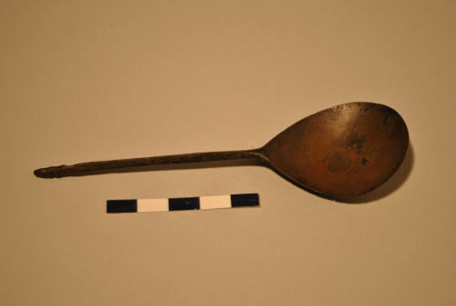 Cucchiaio con profonda conca ovale. Stelo poligonale con terminazione a pigna schematica.
