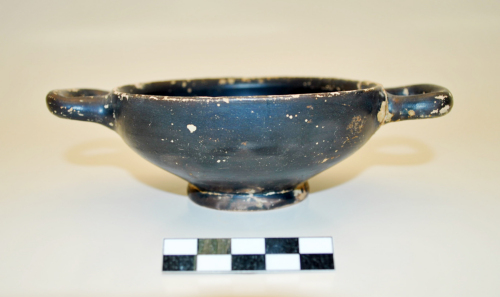 Kylix con orlo assottigliato, vasca carenata, piede ad anello, anse a bastoncello, orizzontali e non ripiegate ad orecchio, sul fondo del piede, non verniciato, pronunciato umbone di tornitura. Allinterno della vasca al centro, cerchiello impresso e quattro giri concentrici di rotellature a trattini obliqui verso s., incisi. Sul fondo esterno del piede una X graffita a crudo. L'argilla è di colore rosata, la vernice è nera opaca, diluita, chiazze rossastre sulla parete esterna, in prossimità del piede, tracce di impronte digitali.
