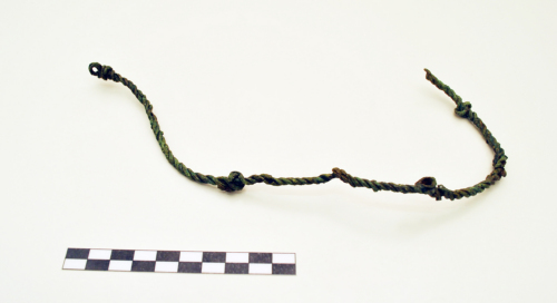 Torques a nodi, di tipo celtico, costituito da tre fili attorcigliati con tre nodi interposti ad anse strette, una estremità ad anello; i tre nodi sono alla distanza luno dallaltro di ca. 8 cm. Patina di colore verde oliva.