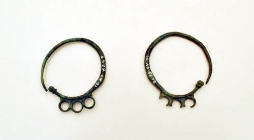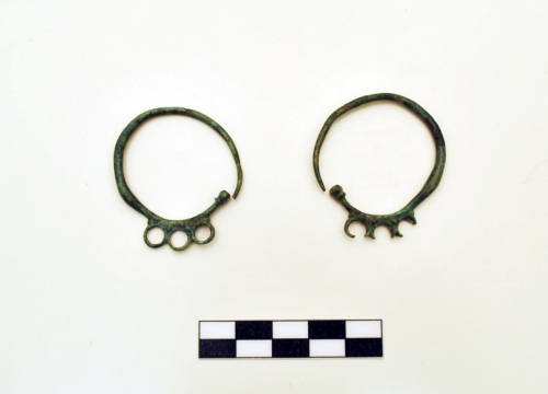 Due orecchini del tipo pinguentino o ad anelli saldati con verga a sezione circolare che si assottiglia verso la punta, tre cerchielli ravvicinati ai quali erano appesi dei pendenti, estremità a bottoncino modanato. Il tipo deriva probababilmente da archetipi bizantini in oro, diffusi, tra il VII e l'VIII sec. d.C., in una vasta area comprendente lIstria, il Friuli, il Veneto, Imola, Capua, la Sicilia, forme simili sono state rinvenute anche in Grecia e in Egitto. Patina di colore verde scuro.