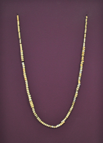 Collana con vaghi in pasta vitrea dorata e avorio del tipo Grancia, di forma globulare molto schiacciati ai poli con foro centrale passante, sono uniti insieme da tre fino a 7 vaghi in gruppi, questi gruppi in totale sono circa 49. Le perle sono alcune lisciate, altre striate in senso verticale come il foro, le gradazioni di colore passano dal bianco avorio, al giallo, allazzurro.