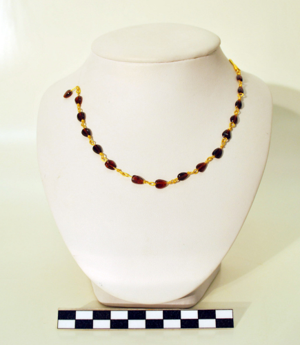 Collana composta da maglie di ca. 1 cm di lunghezza formate da un filo in oro. Ogni segmento di filo ha una estremità chiusa ad anello e una infilata nella gemma e quindi nell'anello della maglia successiva; infine, è avvolto su stesso. La sezione del filo d'oro è appiattita soprattutto in corrispondenza dell'anelllo, più tondeggiante all'altra estremità. Le sedici gemme conservate sono omogenee per colore, dimensione e taglio a forma di cuore. All'estremità di chiusura della collana un segmento di filo aureo forma un gancio che doveva trovare un occhiello funzionale alla chiusura, ora mancante. La tipologia della collana è nota nella tradizione dell'oreficeria ellenistica, in particolare tarantina tra III e I sec. a.C., ma i modelli trovano ampia diffusione nella prima età imperiale romana (I-II sec. d.C.). Nell'Italia nord-orientale sono noti un numero limitato di esemplari di questo tipo a Brescia, nel Trentino e ad Aquileia.