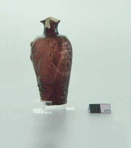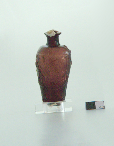 labbro estroflesso con residui dell'attacco delle anse; breve collo cilindrico; spalla arrotondata; ventre troncoconico con in rilievo scene tratte dal mito di Aiace Telamonio. Faccia A: Aiace armato di elmo, scudo e lancia in posizione di attacco a sinistra, sulla prora di una delle dodici navi a sei remi di Salamina che lui stesso guidava; sotto la nave raffigurazione stilizzata del mare con i pesci. Faccia B: Aiace seduto sotto un ulivo a destra, raffigurato nel momento prima di impazzire, con sullo sfondo una delle pecore di cui farà strage. Fondo piano. Vetro viola trasparente; anse in vetro bianco opaco.