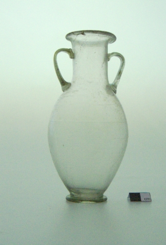 labbro esoverso e ingrossato,collo cilindrico, a tre quarti del quale sono state saldate due anse a fettuccia impostate sulla base dello stesso, modellate a parte e applicate a caldo; spalla arrotondata; ventre ovoidale su cui sono presenti quattro solcature orizzontali; fondo con piede ad anello. Vetro incolore, trasparente.