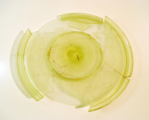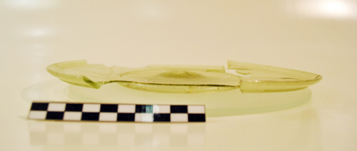 Piatto con orlo arrotondato e obliquo che si stacca dalla parete con un profondo incavo, vasca bassa a profilo quasi orizzontale, al centro, cerchio inciso e fondo ad anello internamente umbilicato con tracce del puntello. Il vetro è di colore verdino, trasparente.