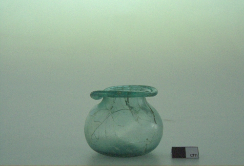 labbro con doppia ribattitura all'esterno e all'interno e appiattito;cortissimo collo; spalla sfuggente; ventre globulare schiacciato e fondo piano. Vetro verdeazzurro trasparente.
