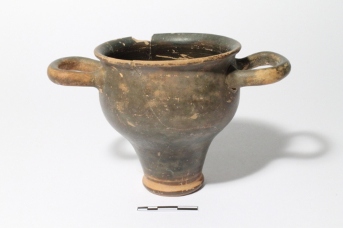 Il reperto presenta un basso piede ad anello, corpo a profilo piriforme, orlo verticale indistinto, labbro leggermente estroflesso e assottigliato. In posizione speculare, poco al di sotto del labbro sono presenti due larghe anse orizzontali a sezione ellittica. casuccio pp. 317-318 n 100
