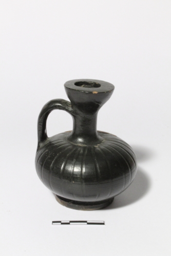 Il reperto presenta un basso piede ad anello, corpo a profilo globulare schiacciato, sottile collo cilindrico, grosso orlo "a imbuto", largo labbro appiattito superiormente e ansa a sezione ellittica. Il corpo è caratterizzato da una sequenza di linee verticali incise.