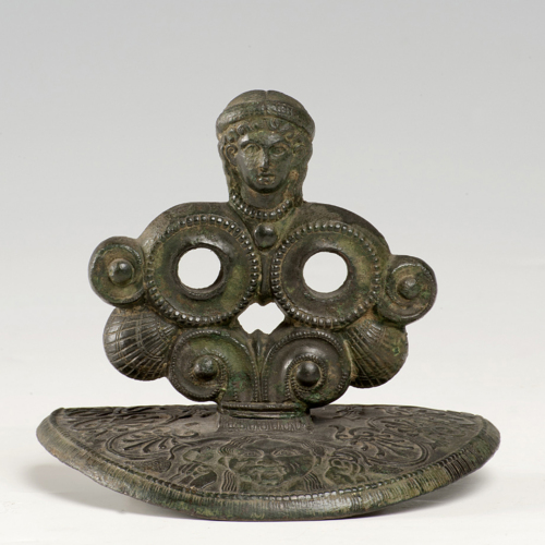 L'applique è costituita da una placca di forma lunata, sulla quale è stata realizzata una decorazione in cui vi sono una testa di gorgone che stringe due serpenti, racemi vegetali, palmette e fiori. Sopra il Gorgoneion, si trova una una doppia serie di volute, da cui si dipartono delle palmette e al cui apice si trova una testa femminile dai lineamenti morbidi, capelli che sono resi con ampie ciocche ad anelli e fissati da un diadema.