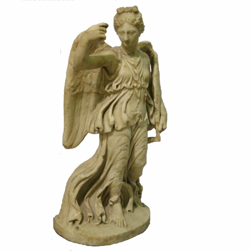 La statuetta ritrae una figura femminile dalle ampie ali piumate, colta nell'istante in cui atterra, posando delicatamente il piede destro sul terreno. La lunga e sottile veste colpita dal vento aderisce al corpo evidenziandone l'esile figura. Il viso è reclinato verso il basso: i capelli, morbidi e ondulati, sono bipartiti sulla fronte da una scriminatura centrale e si annodano sulla nuca in un morbido intreccio. Il braccio destro si solleva davanti al viso, mentre il sinistro è disteso lungo il fianco. La scultura poggia su una base liscia di forma ovale.