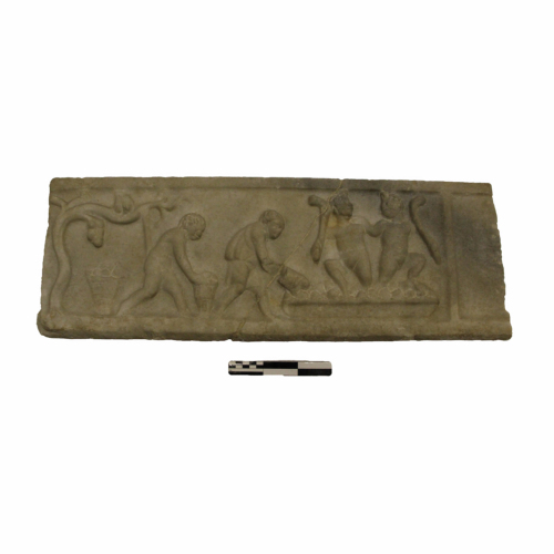 Il rilievo raffigura una scena di vendemmia: sulla sinistra una vite carica di uva protende i propri rami verso un satiro, curvo su una pesante cesta colma di frutti. Davanti a lui, un secondo satiro getta gli acini d'uva in un'ampia vasca dove due altri individui li calpestano e spremono.
