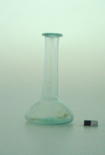 labbro estroflesso con orlo ripiegato all'interno;lungo collo cilindrico leggermente strozzato alla base; spalla sfuggente;ventre conico; fondo piatto. Vetro verdeazzurro, trasparente.