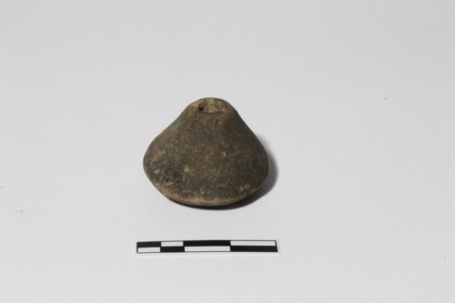 Il reperto presenta un corpo a profilo conico, con la base piana leggermente convessa; è attraversato in posizione centrale da un foro circolare passante.