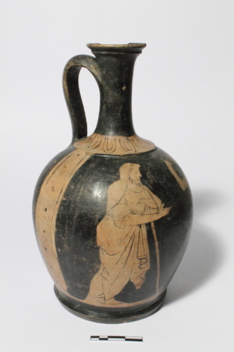 Il reperto presenta un piede a disco distinto, corpo a profilo ovoidale, stretto collo cilindrico distinto alla base da uno scalino in rilievo, orlo distinto da una nervatura orizzontale e labbro estroflesso, appiattito superiormente. Il corpo è decorato da due figure affrontate, dipinte in rosso e rese con una sottile linea nera: con tratti piuttosto grossolani sono raffigurati affrontati un vecchio, ammantato e appoggiato su un bastone, e un giovane, apprentemente nudo.
