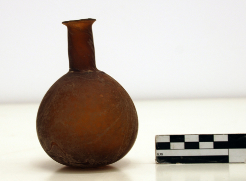 Balsamario con orlo estroflesso, tagliato e arrotondato, con breve collo sottolineato da una strozzatura, con corpo piriforme arrotondato e base piana.