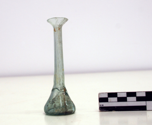 Balsamario con orlo estroflesso, tagliato e arrotondato, con collo cilindrico, lungo e sottile, sottolineato da una strozzatura, con corpo conico campaniforme e base lievemente concava.