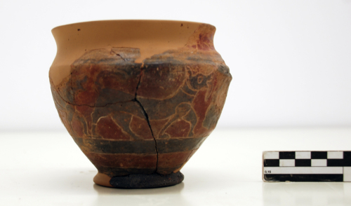 Vasetto con labbro lievemente estroflesso dipinto in rosso, breve spalla dipinta in nero con due solcature orizzontali, corpo troncoconico e basso piede a disco.; rimangono gli attacchi di due anse verticali. Sul corpo, un'alta fascia in rosso con teoria di quattro animali fantastici gradienti verso destra, dipinti in nero e con i particolari a graffito. Sopra il piede, tre basse fasce orizzontali rosse e nere.