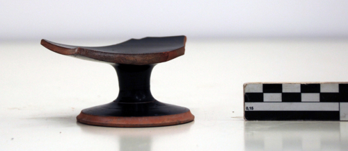 Coppa con vasca poco profonda, piede su basso stelo con base espansa, distinta da due sottili solcature e con margine segnato da una gola risparmiata. Risparmiato l'interno cavo sull superficie d'appoggio e sul fondo.