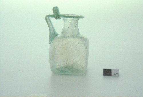 labbro estroflesso e ripiegato all'interno a cordoncino; breve collo cilindrico; spalla arrotondata; corpo cubico; fondo piano. Ansa bicostolata fusa a parte e applicata a caldo, impostata sulla spalla e fissata all'orlo, con un'apofisi. Vetro verdeazzurro, trasparente.
