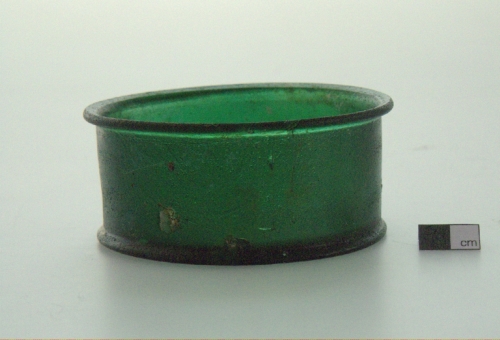 labbro estroflesso con orlo arrotondato; corpo cilindrico; fondo a piede esoverso. Vetro verde,opaco.