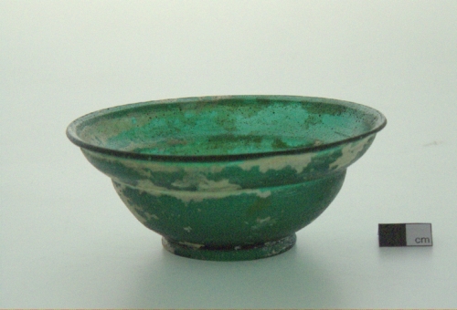 labbro estroflesso e apiattito; corpo tronoconico carenato; fondo con piede ad anello. Vetro verde,opaco.