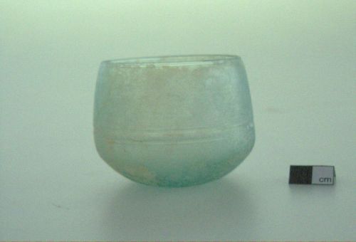 orlo tagliato a spigolo vivo, corpo "a sacco" decorato lungo la circonferenza massima da linee anulari, fondo piano; vetro azzurro trasparente